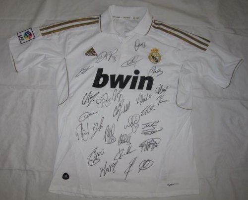 2011-12 Real Madrid team signed soccer jersey Cristiano Ronaldo + Jose Mourinho +24 - Autographed Soccer JerseysBrand new Adidas soccer jersey signed by the 2011-12 Real Madrid soccer team. The jersey has been signed by 26 names including Manager Jose Mourinho, Cristiano Ronaldo, Iker Casillas, Mesut Ozil, Angel Di Maria, Pepe, Karim Benzema, Sergio Ramos, Xabi Alonso, Kaka, Gonzolo Higuain, Raul Albiol, Alvaro Arbeloa, Ricardo Carvalho, Marcelo, Jose Maria Callejon, Sami Khedira, Fabio Coentrao, Nuri Sahin, Raphael Varane, Hamit Altintop, Esteban Granero, Lass, Adan, and Sporting Director Zinedine Zidane! This is a very strong team with great players and the best manager in the world. Comes fully certified with Certificate of Authenticity and tamper-evident hologram. Also backed by SportsMemorabilia s Authenticity Guarantee.
